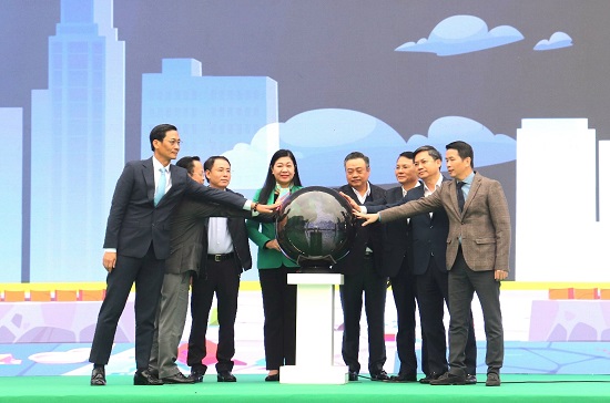 Lãnh đạo thành phố Hà Nội thực hiện nghi thức phát động phong trào thi đua “Sáng - xanh - sạch - đẹp”. Ảnh: Hoàng Sơn