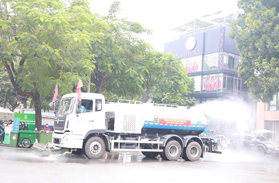 Sau lễ phát động, công nhân Công ty URENCO Hà Nội ra quân dọn vệ sinh, phun nước rửa đường làm sạch môi trường. Ảnh: Hoàng Sơn