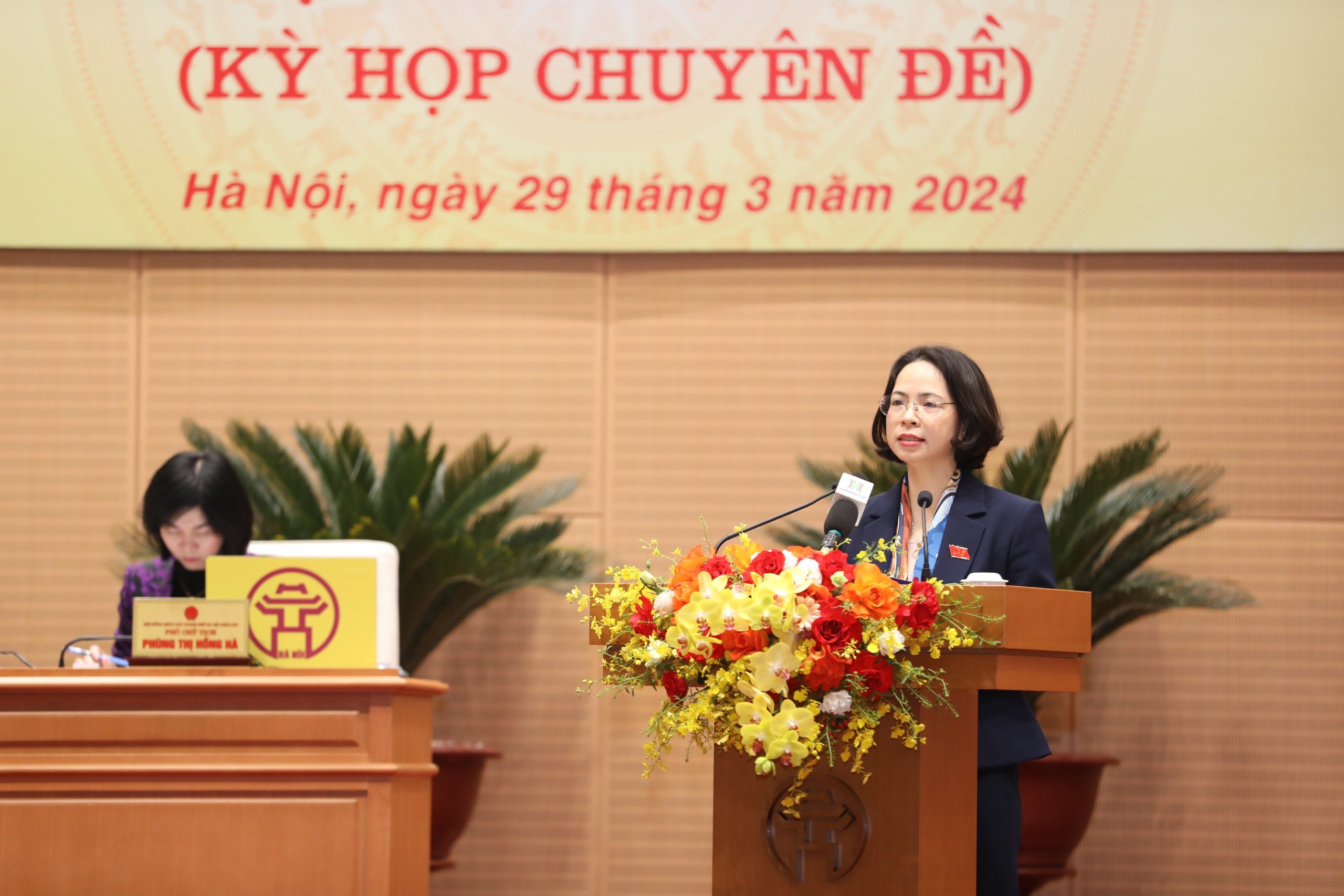 Phó Trưởng ban Pháp chế HĐND Thành phố Hoàng Thị Thuý Hằng trình bày báo cáo thẩm tra nghị quyết
