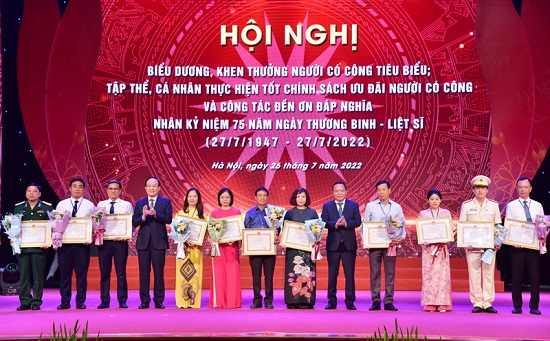 Cùng với đó, UBND thành phố Hà Nội cũng ban hành Quyết định số 2565/QĐ-UBND ngày 21-7-2022, tặng Bằng khen cho 66 tập thể, 306 cá nhân có thành tích thực hiện tốt chính sách ưu đãi người có công và công tác “Đền ơn, đáp nghĩa”. Trong khuôn khổ chương trình hội nghị, các đồng chí lãnh đạo Bộ Lao động - Thương binh và Xã hội, lãnh đạo Thành ủy, HĐND, UBND, Ủy ban Mặt trận Tổ quốc Việt Nam thành phố Hà Nội đã trân trọng trao tặng Bằng khen cho đại diện các tập thể, cá nhân tiêu biểu.