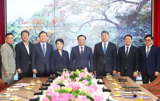 Bí thư Thành ủy Hà Nội Đinh Tiến Dũng, đại sứ tỉnh Gyeonggi (Hàn Quốc) Kang Kum-sil và các đại biểu tại buổi tiếp.