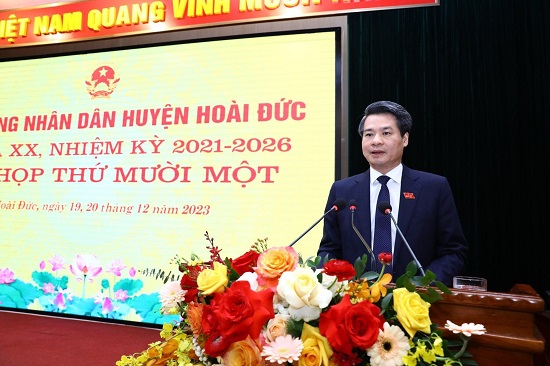 Dự và phát biểu tại kỳ họp, Ủy viên Ban Thường vụ Thành ủy, Trưởng ban Nội chính Thành ủy Nguyễn Quang Đức nhấn mạnh: Năm 2024, huyện Hoài Đức cần tiếp tục tập trung rà soát các chỉ tiêu, nhiệm vụ mà Nghị quyết Đại hội Đảng bộ huyện đề ra, có kế hoạch cụ thể thực hiện "tăng tốc để về đích"; rà soát, nâng cao các tiêu chí nông thôn mới gắn với các tiêu chí phường, quận. Trong hoàn thiện các tiêu chí phường, quận, huyện cần quan tâm nội dung điều chỉnh địa giới hành chính một số xã theo yêu cầu, tiêu chí phường, bảo đảm sự phát triển ổn định; xây dựng kế hoạch, cố gắng hoàn thành vào năm 2024 đối với 3 tiêu chí còn chưa đạt.