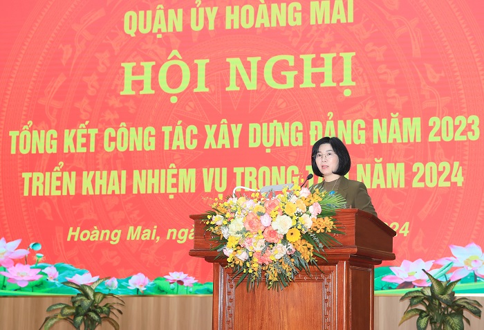Biểu dương và chúc mừng những kết quả mà Đảng bộ, chính quyền và nhân dân quận Hoàng Mai đã đạt được trong năm 2023. Phó Chủ tịch Thường trực HĐND Thành phố Phùng Thị Hồng Hà đề nghị, năm 2024, Quận ủy Hoàng Mai tiếp tục tăng cường công tác xây dựng, chỉnh đốn Đảng, xây dựng hệ thống chính trị trong sạch, vững mạnh. Đổi mới phương thức lãnh đạo, chỉ đạo của cấp ủy, chính quyền các cấp gắn với thực hiện Chỉ thị số 24-CT/TU, ngày 07/8/2023, của Thành ủy về “Tăng cường kỷ cương, kỷ luật và trách nhiệm giải quyết công việc trong hệ thống chính trị thành phố Hà Nội”. Bên cạnh việc chỉ đạo, lãnh đạo toàn diện các nhiệm vụ, cần lựa chọn, xác định các nhiệm vụ trọng tâm, trọng điểm, để chỉ đạo quyết liệt.