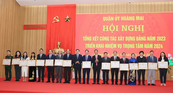 Với những kết quả nổi bật, toàn diện trên các lĩnh vực, năm 2023, các chỉ tiêu về xây dựng Đảng của quận Hoàng Mai đều vượt so với kế hoạch, 20% tổ chức cơ sở Đảng hoàn thành xuất sắc nhiệm vụ đạt 20% (16/81), 100% hoàn thành tốt nhiệm vụ. Các Ban Đảng, Văn phòng Quận ủy, MTTQ và các đoàn thể chính trị - xã hội quận đều được ngành dọc Thành phố đánh giá, xếp loại hoàn thành xuất sắc nhiệm vụ được Trung ương, Ban Thường vụ Thành ủy, UBND Thành phố tặng Bằng khen. Điển hình, Đoàn Thanh niên quận được Chủ tịch nước tặng Huân chương lao động Hạng Nhì, Ban Tổ chức Quận ủy được Thủ tướng Chính phủ tặng Bằng khen, Hội Liên hiệp Phụ nữ quận nhận Cờ thi đua của UBND Thành phố…