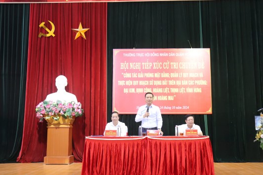 Ngày 24/10/2024, Thường trực HĐND quận Hoàng Mai tổ chức hội nghị tiếp xúc cử tri chuyên đề “Công tác giải phóng mặt bằng; quản lý quy hoạch và thực hiện quy hoạch sử dụng đất trên địa bàn các phường Đại Kim, Định Công, Hoàng Liệt, Thịnh Liệt, Vĩnh Hưng quận Hoàng Mai”.