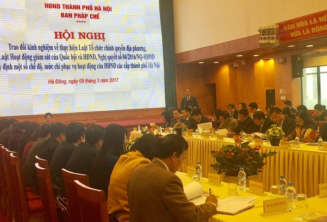 Ngày 09/3, Ban Pháp chế HĐND Thành phố đã tổ chức Hội nghị Ban Pháp chế HĐND thành phố với Ban Pháp chế HĐND quận, huyện, thị xã trao đổi kinh nghiệm, tọa đàm về áp dụng Luật Tổ chức chính quyền địa phương, Luật Hoạt động giám sát của Quốc hội và HĐND, Nghị quyết số 04/2016/NQ-HĐND ngày 01/8/2016 quy định một số chế độ, mức chi phục vụ hoạt động của HĐND các cấp thành phố Hà Nội.