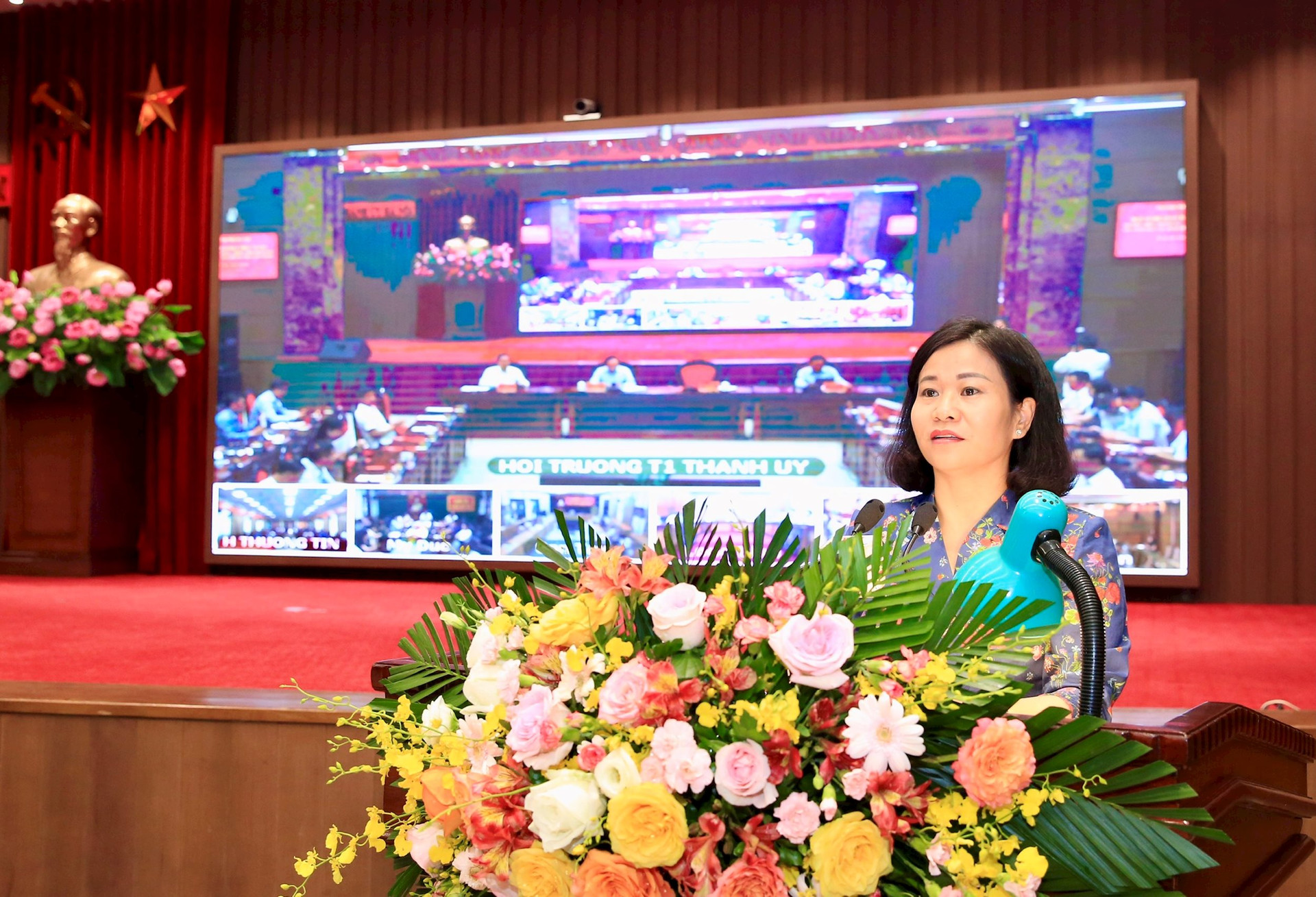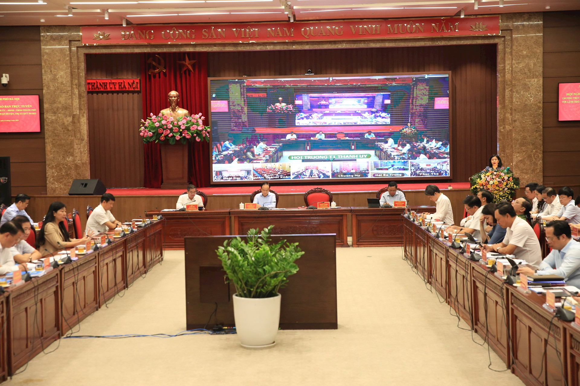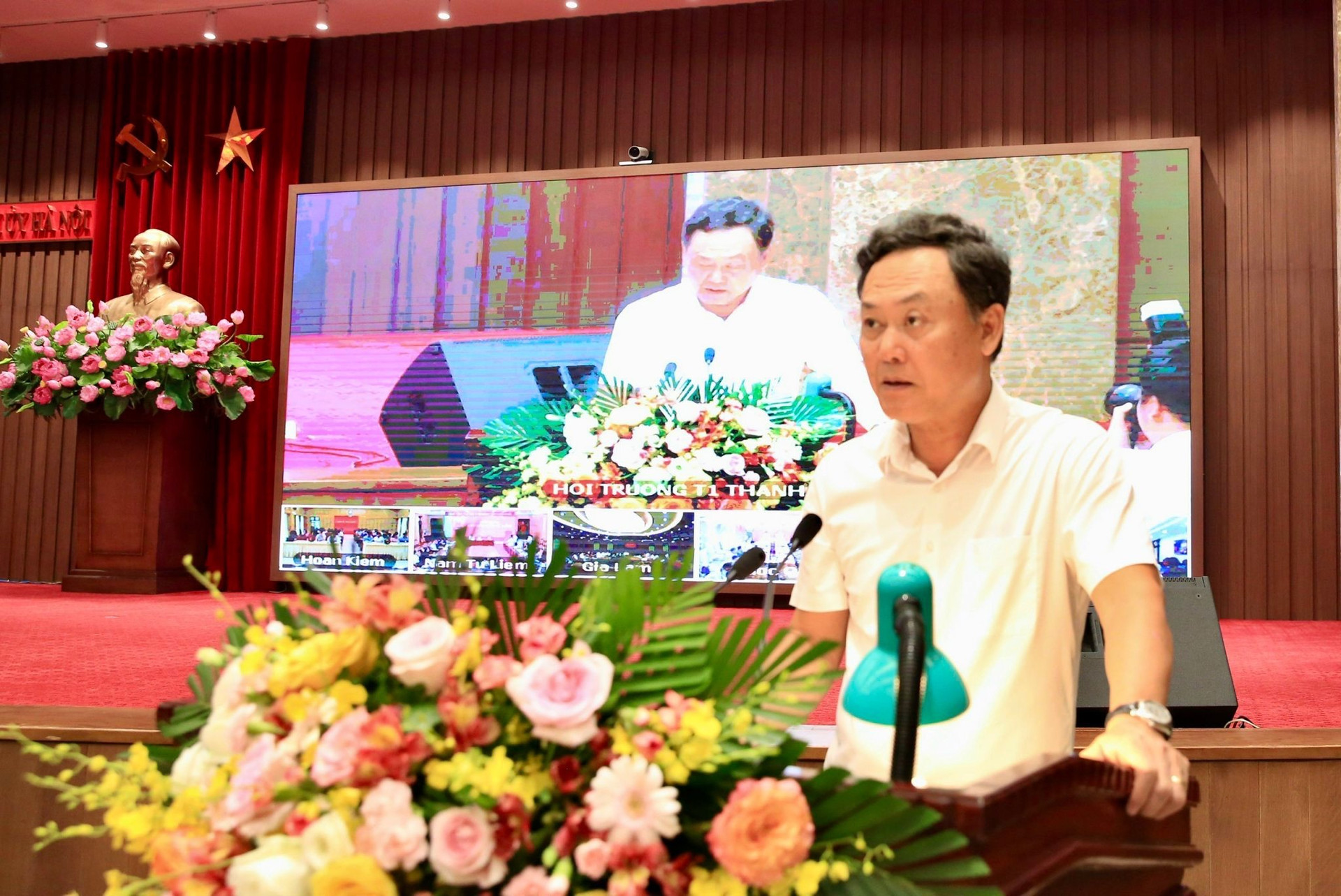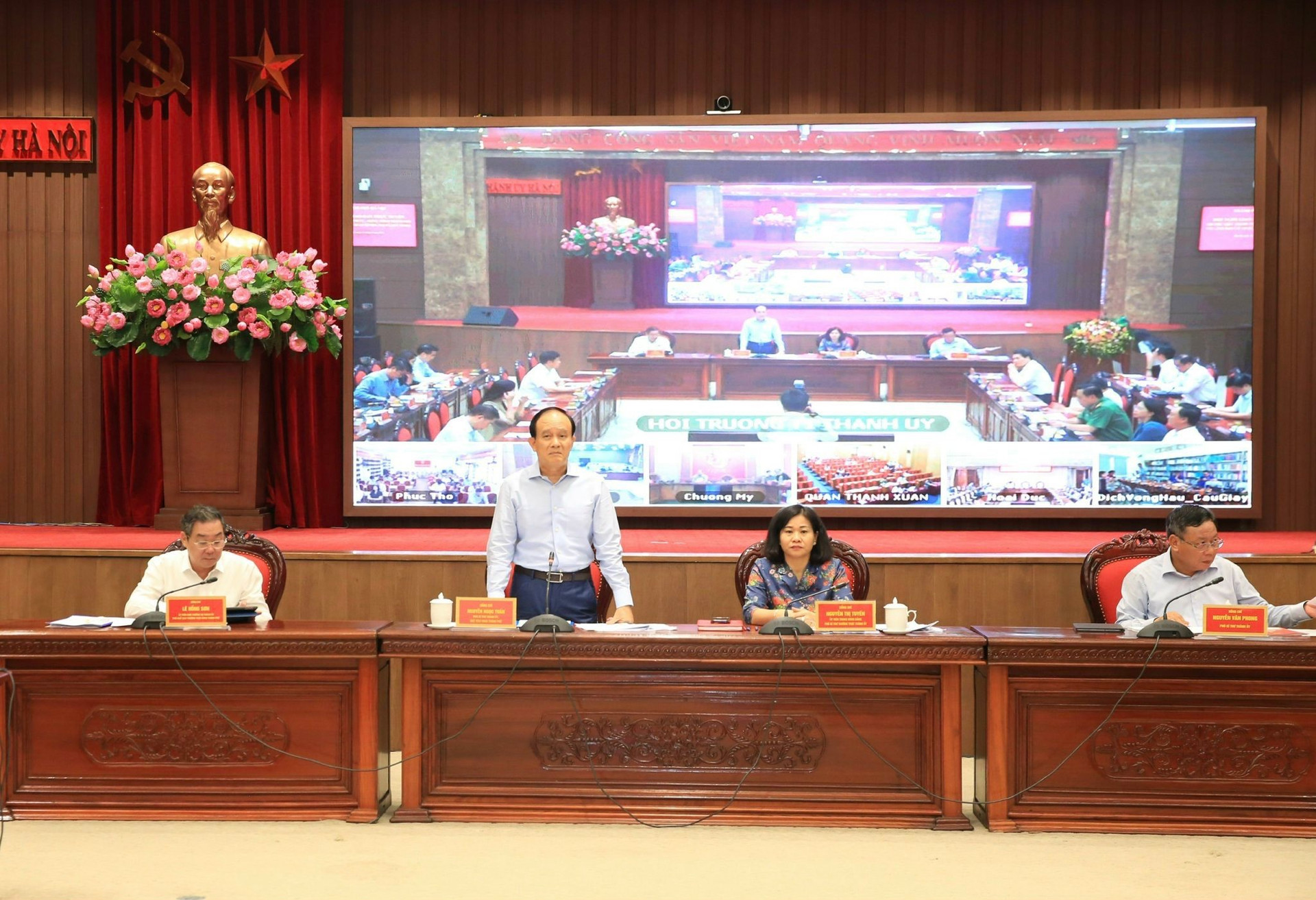 Chủ trì hội nghị tại điểm cầu chính tại trụ sở Thành ủy Hà Nội có các đồng chí: Ủy viên Trung ương Đảng, Phó Bí thư Thường trực Thành ủy Nguyễn Thị Tuyến; Phó Bí thư Thành ủy, Chủ tịch HĐND thành phố, Phó Trưởng đoàn ĐBQH thành phố Nguyễn Ngọc Tuấn; Phó Bí thư Thành ủy Nguyễn Văn Phong; Ủy viên Ban Thường vụ Thành ủy, Phó Chủ tịch Thường trực UBND thành phố Lê Hồng Sơn.