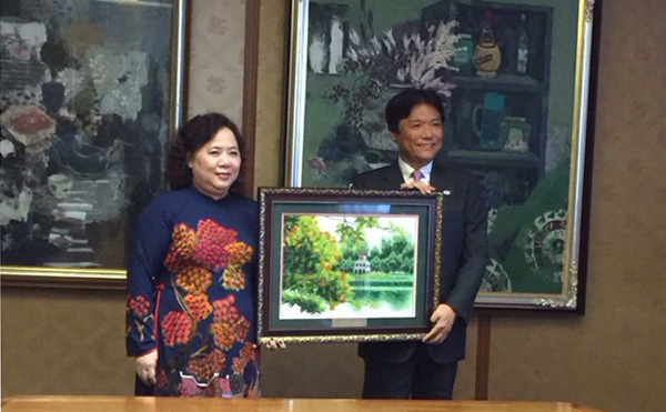 Phó Bí thư Thành ủy, Chủ tịch HĐND TP Hà Nội Nguyễn Thị Bích Ngọc tặng bức tranh Hồ Gươm cho lãnh đạo tỉnh Fukuoka