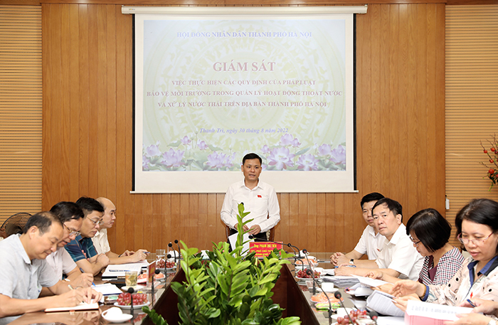 Sáng 30/8/2022, đoàn giám sát của Hội đồng nhân dân thành phố Hà Nội làm việc với UBND huyện Thanh Trì về việc thực hiện các quy định của pháp luật bảo vệ môi trường trong quản lý hoạt động thoát nước và xử lý nước thải trên địa bàn. Đồng chí Phạm Quí Tiên, Thành uỷ viên, Phó Chủ tịch HĐND thành phố, Trưởng đoàn giám sát chủ trì buổi làm việc.