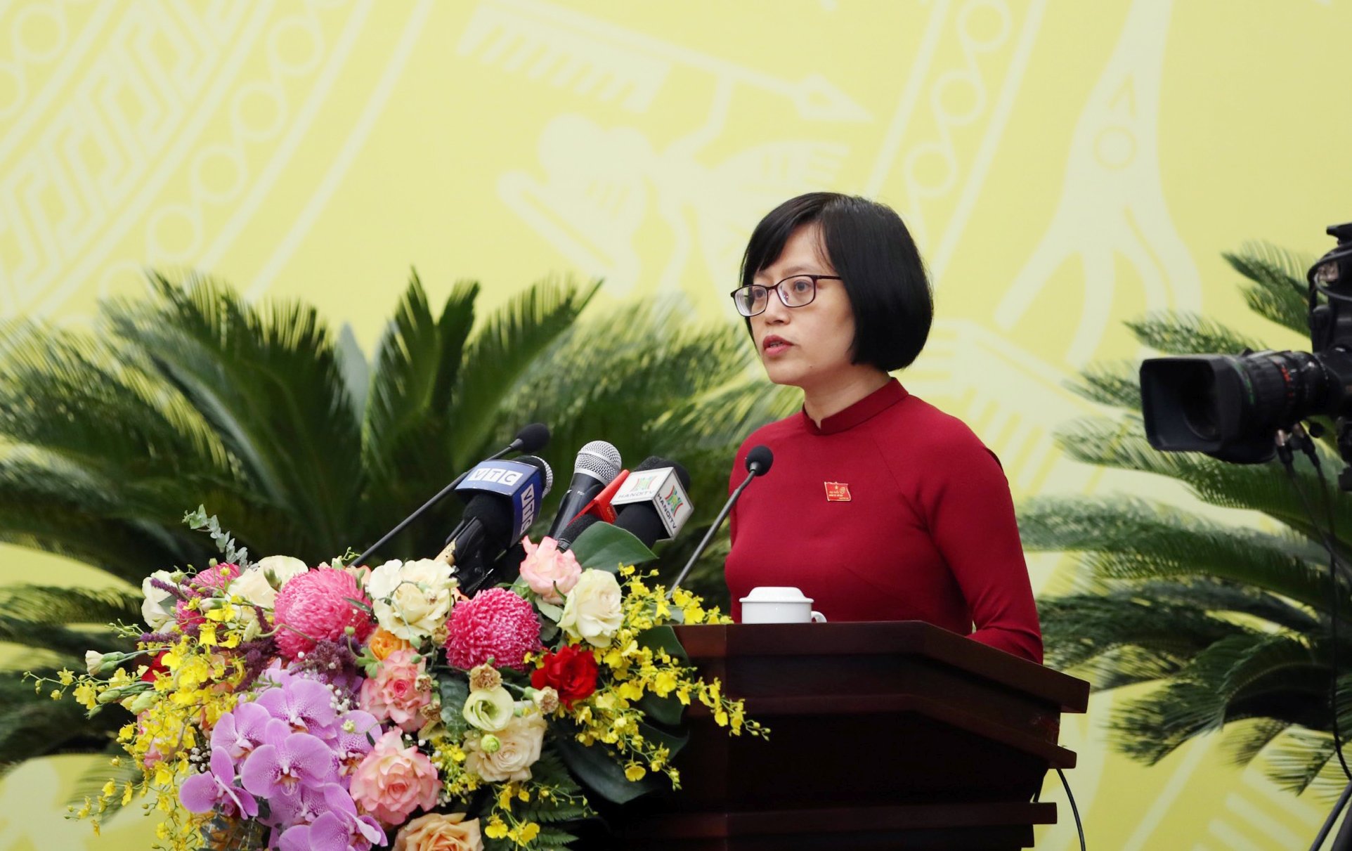 Phó Chủ tịch Thường trực HĐND thành phố Hà Nội Phùng Thị Hồng Hà trình bày báo cáo tại kỳ họp