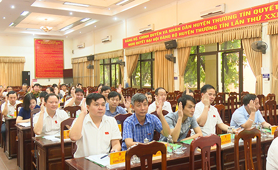 Đại biểu HĐND huyện biểu quyết thông qua nghị quyết kỳ họp