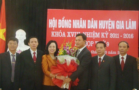 Trưởng ban Tổ chức Thành ủy Ngô Thị Thanh Hằng và lãnh đạo huyện Gia Lâm chúc mừng tân Chủ tịch UBND huyện (Ảnh: hanoi.gov.vn)
