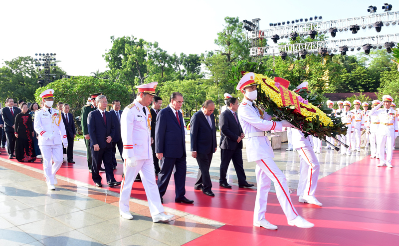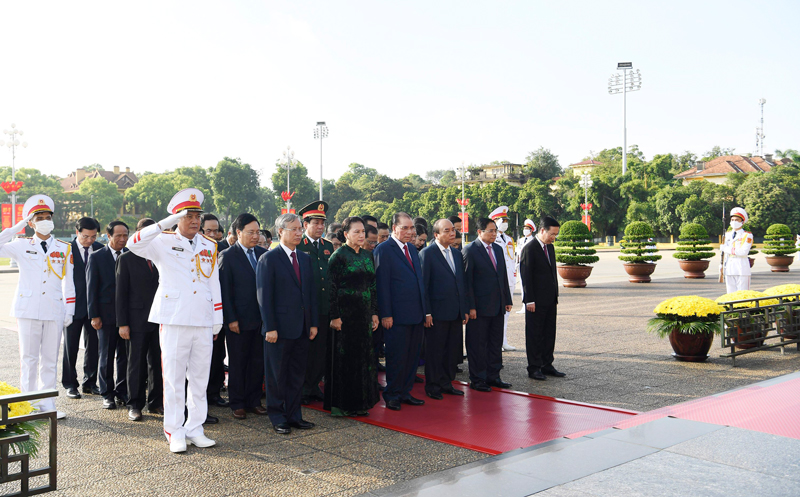 Tiếp đó, các đồng chí lãnh đạo Đảng, Nhà nước, Mặt trận Tổ quốc Việt Nam đặt vòng hoa, vào Lăng viếng Chủ tịch Hồ Chí Minh; thành kính bày tỏ lòng biết ơn vô hạn đối với công lao to lớn của Người đối với sự nghiệp cách mạng vẻ vang của Đảng và dân tộc ta.