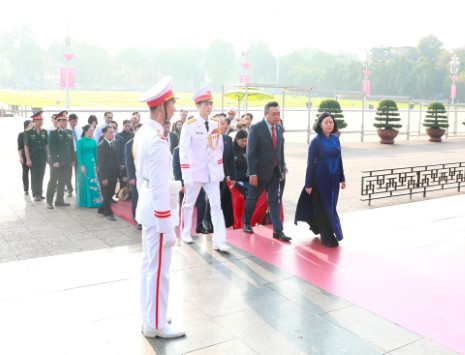 Đoàn đại biểu thành phố Hà Nội do Bí thư Thành ủy Bùi Thị Minh Hoài dẫn đầu vào Lăng viếng Chủ tịch Hồ Chí Minh. Ảnh: Viết Thành