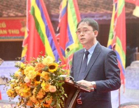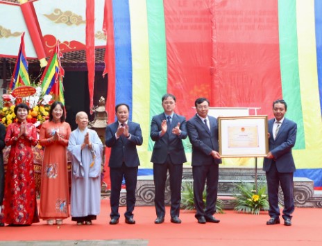 Thứ trưởng Bộ Văn hóa, Thể thao và Du lịch Hoàng Đạo Cương trao Quyết định của Bộ trưởng Bộ Văn hóa, Thể thao và Du lịch về việc công bố Danh mục di sản văn hóa phi vật thể quốc gia đối với “Lễ hội đền Hai Bà Trưng” phường Đồng Nhân và phường Bạch Đằng. Ảnh: Viết Thành