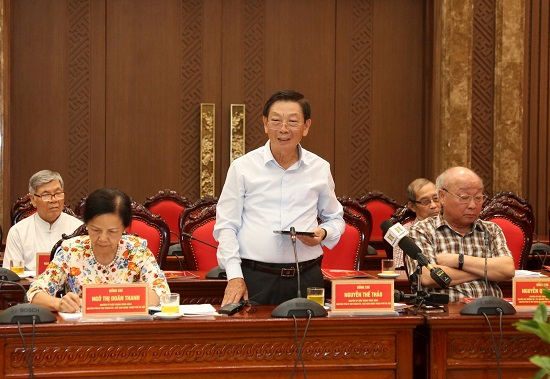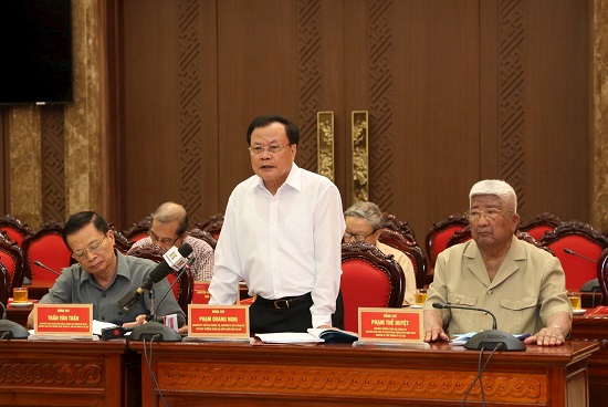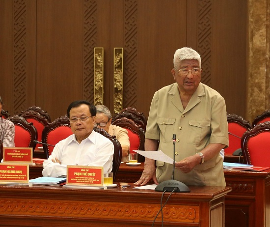 Nguyên Bí thư Thành ủy, nguyên Chủ tịch Ủy ban Trung ương Mặt trận Tổ quốc Việt Nam Phạm Thế Duyệt phát biểu ý kiến.