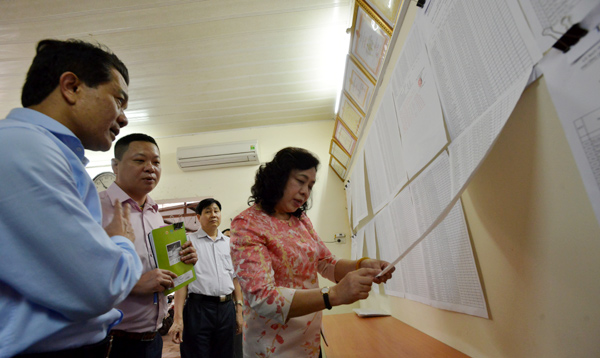 Phó Bí thư Thường trực Thành ủy Hà Nội Ngô Thị Thanh Hằng kiểm tra điểm tại một điểm niêm yết danh sách cử tri của phường Quán Thánh, quận Ba Đình