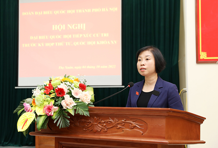 Thay mặt các đại biểu Quốc hội thuộc Đơn vị bầu cử số 7, Phó Trưởng đoàn chuyên trách Đoàn đại biểu Quốc hội thành phố Phạm Thị Thanh Mai đã tiếp thu kiến nghị của cử tri huyện Đan Phượng, đồng thời thông tin với cử tri về dự kiến các nội dung sẽ được Quốc hội xem xét, thông qua tại kỳ họp thứ 4, Quốc hội khóa XV; các kết quả nổi bật trong phát triển kinh tế-xã hội của Thủ đô, đất nước và các giải pháp, nhiệm vụ lớn Thành phố đang tích cực triển khai, đặc biệt là giải ngân đầu tư công.