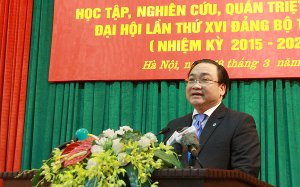 Đồng chí cũng yêu cầu các cấp ủy đảng, chính quyền, các tổ chức chính trị - xã hội tiếp tục quán triệt sâu rộng trong cán bộ, đảng viên, tuyên truyền rộng rãi trong đoàn viên, hội viên và các tầng lớp nhân dân Thủ đô về Nghị quyết Đại hội lần thứ XVI Đảng bộ Thành phố; đổi mới việc tổ chức nghiên cứu, quán triệt nghị quyết theo hướng: cần làm rõ ý nghĩa, tầm quan trọng của nghị quyết; xác định rõ trọng tâm, trọng điểm, những nội dung cần đi sâu, phân tích rõ để đáp ứng yêu cầu của từng cấp uỷ; tăng cường thảo luận, đối thoại; tạo sự thống nhất về nhận thức, sớm đưa Nghị quyết Đại hội Đảng bộ Thành phố vào cuộc sống. Gắn việc triển khai học tập, quán triệt, thực hiện Nghị quyết Đại hội Đảng bộ Thành phố với việc tiếp tục thực hiện Nghị quyết Trung ương 4 (khóa XI) “Một số vấn đề cấp bách về xây dựng Đảng hiện nay”, với đẩy mạnh việc học tập và làm theo tấm gương đaọ đức Hồ Chí Minh và các phong trào thi đua yêu nước của Thành phố, địa phương, đơn vị.
