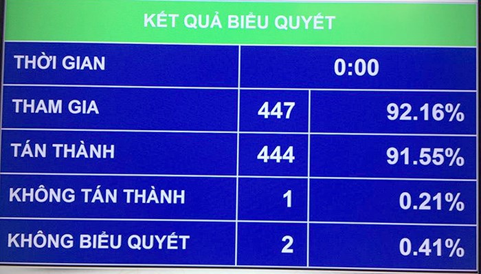 Sau khi nghe Báo cáo giải trình, tiếp thu, chỉnh lý dự thảo Luật Bảo vệ bí mật nhà nước, Quốc hội tiến hành biểu quyết thông qua dự thảo Luật với 444 đại biểu tán thành, chiếm 91,55% tổng số đại biểu Quốc hội tham gia biểu quyết.