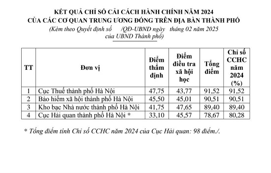 Về kết quả Chỉ số CCHC năm 2024 của các cơ quan Trung ương đóng trên địa bàn thành phố Hà Nội, dẫn đầu là Cục Thuế thành phố Hà Nội, đạt 91,52%; tiếp theo là các cơ quan: Bảo hiểm xã hội thành phố Hà Nội, đạt 90,51%; Kho bạc Nhà nước thành phố Hà Nội, đạt 89,40%; Cục Hải quan thành phố Hà Nội, đạt 80,28%.