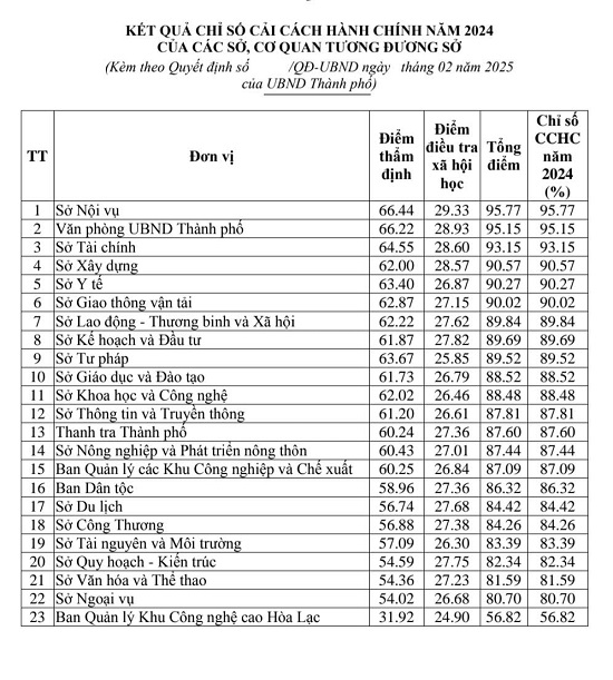 Kết quả Chỉ số CCHC năm 2024 của các sở, cơ quan tương tương sở, dẫn đầu là Sở Nội vụ, đạt 95,77%; đứng thứ hai là Văn phòng UBND thành phố, đạt 95,15%; tiếp theo lần lượt là Sở Tài chính, đạt 93,15%, Sở Xây dựng đạt 90,57%, Sở Y tế đạt 90,27…; đứng cuối bảng là Ban Quản lý khu công nghệ cao Hòa Lạc, đạt 56,82%.