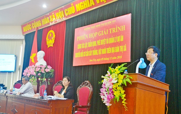 Thực hiện Luật Tổ chức chính quyền địa phương, sáng ngày 5/12, Thường trực HĐND thị xã Sơn Tây đã tổ chức phiên họp giải trình giữa hai kỳ họp HĐND về công tác lập, thẩm định, phê duyệt và quản lý dự án chuyển đổi cơ cấu cây trồng vật nuôi trên địa bàn. Đồng chí Nguyễn Quang Sơn, Bí thư Thị ủy, Chủ tịch HĐND thị xã chủ trì phiên giải trình.