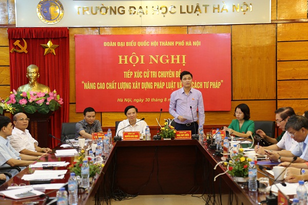 Sáng ngày 30/8/2017, Đoàn đại biểu Quốc hội thành phố Hà Nội phối hợp với Trường Đại học Luật Hà Nội tổ chức Hội nghị tiếp xúc cử tri chuyên đề về “Nâng cao chất lượng xây dựng pháp luật và cải cách tư pháp”. Tham dự Hội nghị có Ủy viên Trung ương Đảng, Chủ nhiệm Ủy ban Pháp luật của Quốc hội Nguyễn Khắc Định, cùng các vị đại biểu Quốc hội thành phố Hà Nội, đại biểu đại diện Ban Dân nguyện, Viện nghiên cứu lập pháp, Bộ Tư pháp, Ban chỉ đạo cải cách tư pháp Trung ương, các nhà nghiên cứu, chuyên gia, giảng viên, sinh viên Trường Đại học Luật Hà Nội.