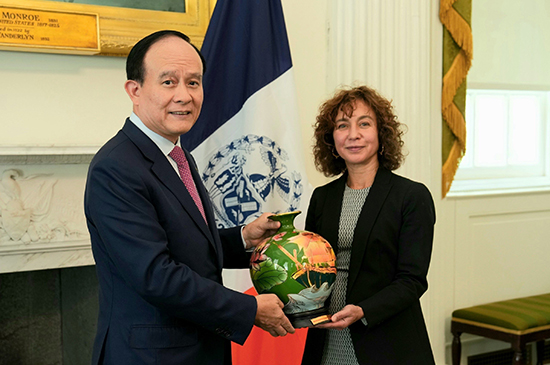Đồng chí Nguyễn Ngọc Tuấn trao quà lưu niệm cho bà Meera Joshi, Phó Thị trưởng phụ trách thành phố New York.