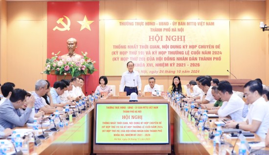Chiều 24/10/2024, Thường trực HĐND, UBND, Ủy ban Mặt trận Tổ quốc (MTTQ) Việt Nam thành phố Hà Nội tổ chức Hội nghị thống nhất nội dung kỳ họp chuyên đề (kỳ họp thứ 19) và kỳ họp thường lệ cuối năm 2024 (kỳ họp thứ 20) của HĐND thành phố khoá XVI, nhiệm kỳ 2021-2026.