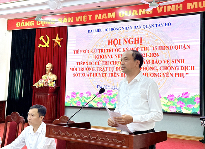 Ngày 25/6/2024, các đại biểu HĐND quận Tây Hồ (Hà Nội) tổ chức tiếp xúc với cử tri phường Yên Phụ trước kỳ họp thứ 15 HĐND quận khoá VI, nhiệm kỳ 2021 – 2026; tiếp xúc cử tri chuyên đề đảm bảo vệ sinh môi trường, trật tự đô thị, phòng chống dịch sốt xuất huyết trên địa bàn phường Yên Phụ.