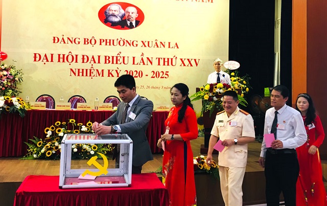 Các đảng viên bỏ phiếu bầu Ban Chấp hành Đảng bộ phường Xuân La (quận Tây Hồ), tháng 3/2020. Ảnh: Ánh Nhuệ