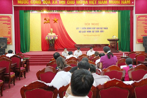 Chiều ngày 25/8/2015, Thường trực HĐND huyện Thạch Thất đã tổ chức hội nghị lấy ý kiến đóng góp vào dự thảo Bộ Luật Hình sự (sửa đổi). Dự hội nghị có: các đồng chí Thường trực HĐND huyện, UB MTTQ huyện; Thủ trưởng các ban xây dựng Đảng và trưởng các đoàn thể chính trị, xã hội huyện; lãnh đạo các ban HĐND huyện, thành viên hội đồng phối hợp phổ biến giáo dục pháp luật huyện; Thủ trưởng các phòng, ban, đơn vị sự nghiệp huyện và các cơ quan tố tụng huyện; Bí thư Đảng ủy, Chủ tịch UBND xã, thị trấn.
