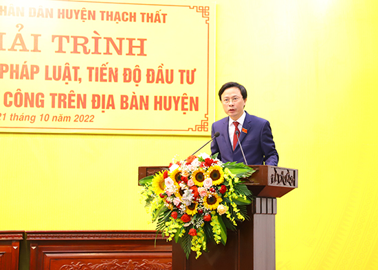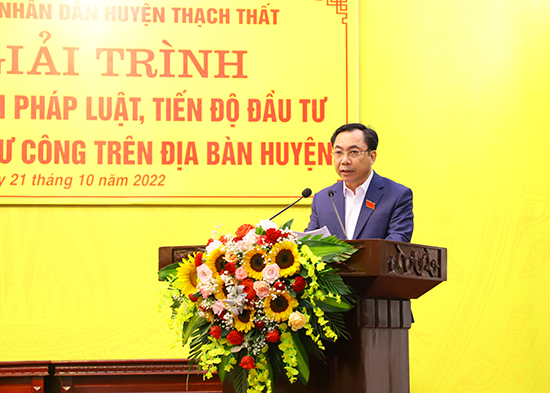 Ngày 21/10/2022, Thường trực HĐND huyện Thạch Thất khoá XX, nhiệm kỳ 2021-2026 tổ chức phiên họp giải trình về chấp hành quy định của pháp luật, tiến độ đầu tư và giải ngân vốn đầu tư công trên địa bàn Huyện năm 2022.