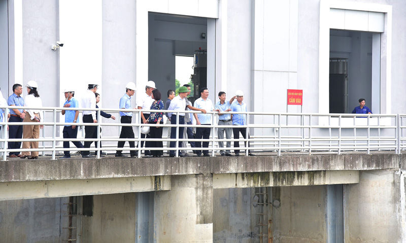Các đồng chí lãnh đạo Thành phố kiểm tra tại Trạm bơm tiêu nước phía Tây Hà Nội