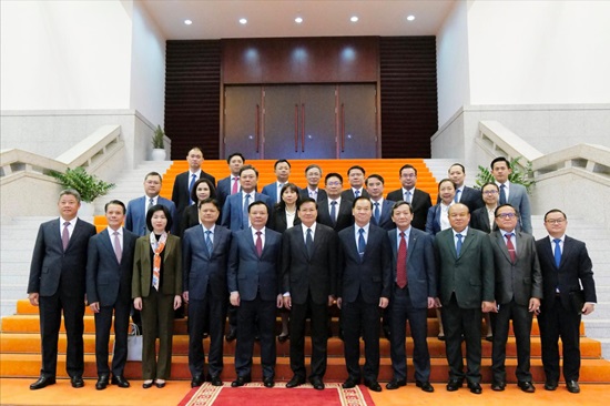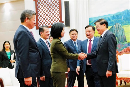 Tổng Bí thư, Chủ tịch nước Lào Thongloun Siíoulith chào đón các thành viên Đoàn đại biểu cấp cao thành phố Hà Nội.