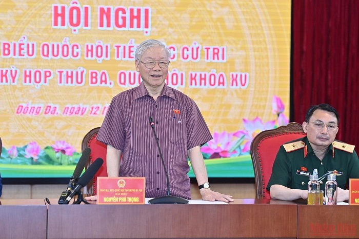 Sáng 12/5/2022, Tổng Bí thư Nguyễn Phú Trọng cùng các đại biểu Quốc hội thuộc Đơn vị bầu cử số 1 thành phố Hà Nội đã tiếp xúc cử tri các quận: Đống Đa, Ba Đình, Hai Bà Trưng trước kỳ họp thứ 3, Quốc hội khóa XV. Hội nghị được tổ chức theo hình thức trực tiếp kết hợp trực tuyến, kết nối từ điểm cầu chính tại trụ sở HĐND - UBND quận Đống Đa tới 56 điểm cầu các phường trên địa bàn 3 quận.