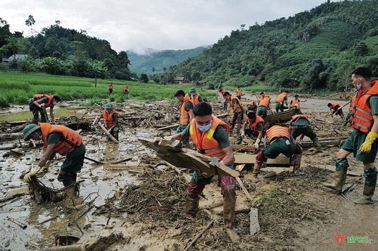 Các chiến sĩ của Trung đoàn 98 và các đơn vị của Sư đoàn 316, Quân khu 2 phối hợp cùng cảnh sát cơ động, biên phòng tỉnh Lào Cai tham gia tìm kiếm người mất tích sau lũ quét tại thôn Làng Nủ, xã Phúc Khánh tháng 9-2024. Ảnh: QĐND