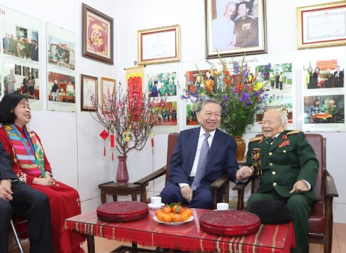 Tổng Bí thư Tô Lâm chúc Tết Thiếu tướng Huỳnh Đắc Hương. Ảnh: Viết Thành