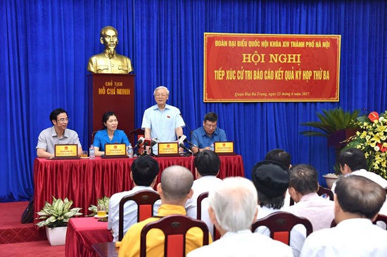Ngày 23-6, Tổng Bí thư Nguyễn Phú Trọng cùng đại biểu Nguyễn Quang Tuấn, đại biểu Trần Thị Phương Hoa đã tiếp xúc cử tri tại quận Hai Bà Trưng, Đống Đa. Cùng dự có Ủy viên Trung ương Đảng, Phó Bí thư Thành ủy, Chủ tịch UBND TP Hà Nội Nguyễn Đức Chung.