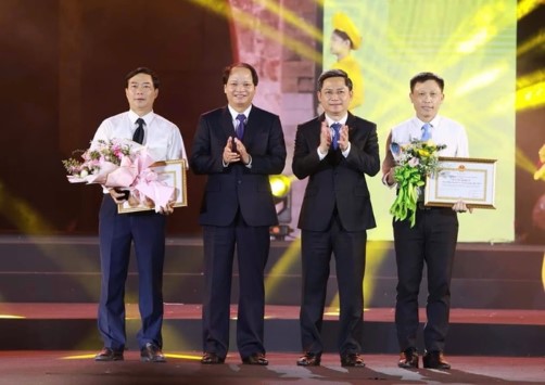 Trưởng ban Tuyên giáo Thành ủy Nguyễn Doãn Toản và Phó Chủ tịch UBND Thành phố Hà Minh Hải trao giải tập thể