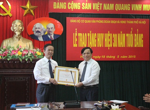 Trong không khí phấn khởi mừng kỷ niệm 125 năm ngày sinh Chủ tịch Hồ Chí Minh (19/5/1890 - 19/5/2015), Chào mừng Đại hội Đảng các cấp tiến tới Đại hội đại biểu toàn quốc lần thứ XII của Đảng. chiều ngày 18/5/2015 Đảng bộ cơ quan Văn phòng Đoàn ĐBQH và HĐND thành phố Hà Nội trang trọng tổ chức Lễ trao tặng Huy hiệu 30 năm tuổi đảng cho đồng chí Bùi Đức Hiếu - Bí thư Đảng ủy, Chánh Văn phòng Đoàn ĐBQH và HĐND Thành phố.