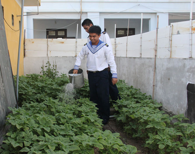 Chiến sĩ đảo Song Tử Tây chăm sóc rau xanh.