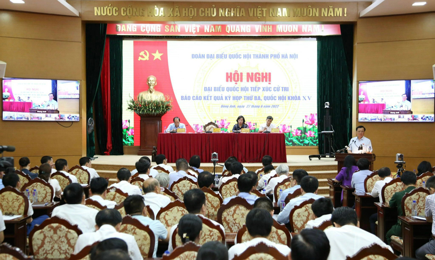 Trao đổi về các ý kiến cử tri nêu, Bí thư Thành ủy Hà Nội cho biết, kỳ họp thứ ba, Quốc hội khóa XV diễn ra rất sôi nổi, khẩn trương, khoa học và trách nhiệm cao. Dù chỉ diễn ra trong 19 ngày, nhưng Quốc hội đã xem xét một khối lượng lớn công việc: Thông qua 5 luật, 17 nghị quyết; cho ý kiến về 6 dự án luật và nhiều nội dung quan trọng khác. Các đại biểu Quốc hội đã thảo luận sôi nổi, tranh luận quyết liệt và thông qua với sự đồng thuận rất cao. Đoàn đại biểu Quốc hội thành phố đã đóng góp 107 lượt ý kiến phát biểu tại tổ và hội trường; trong đó có 19 lượt đại biểu tham gia chất vấn, tranh luận sôi nổi. Nhiều ý kiến của Đoàn đã được Quốc hội tiếp thu, tổng hợp, đưa vào nghị quyết.