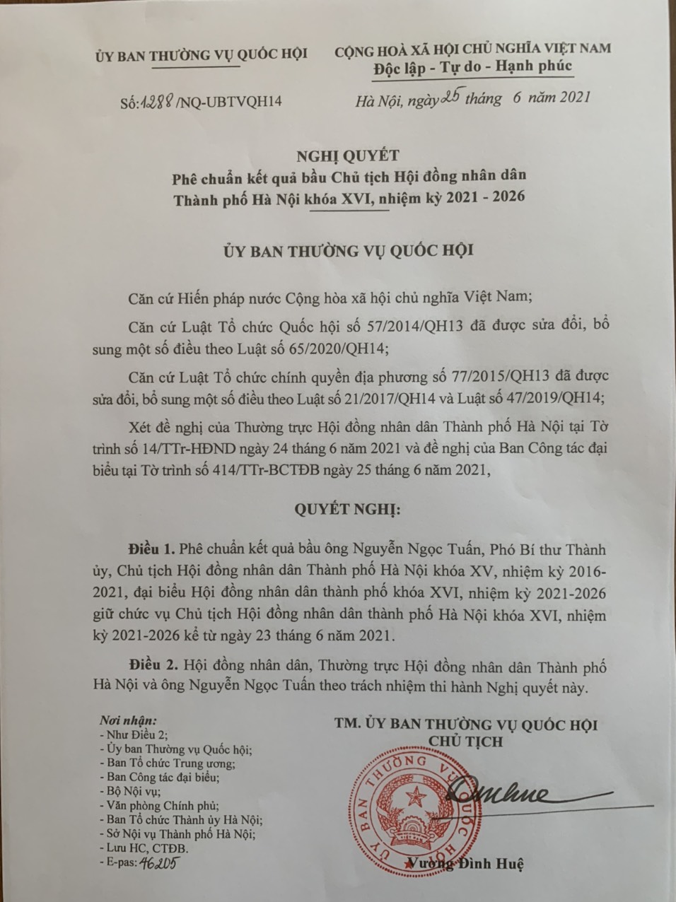 Ngày 25/6, Ủy ban Thường vụ Quốc hội đã ban hành các Nghị quyết số 1288/NQ-UBTVQH14, 1289/NQ-UBTVQH14 và 1290/NQ-UBTVQH14 phê chuẩn kết quả bầu Chủ tịch, các Phó Chủ tịch HĐND thành phố Hà Nội khóa XVI, nhiệm kỳ 2021-2026.