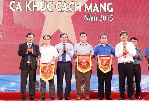 Đồng chí Nguyễn Văn Nam, UVTT HĐND TP cùng lãnh đạo Ban Tuyên giáo Thành ủy, Bí thư Thành đoàn trao giải cho các nhóm Liên hoan tuyên truyền ca khúc cách mạng