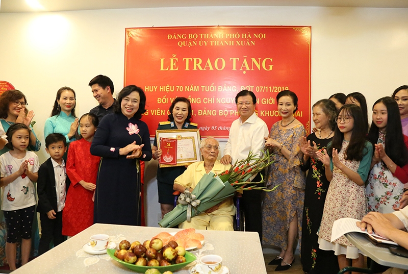 Phó Bí thư Thường trực Thành ủy Ngô Thị Thanh Hằng trao Huy hiệu Đảng cho Đảng viên lão thành tại quận Thanh Xuân