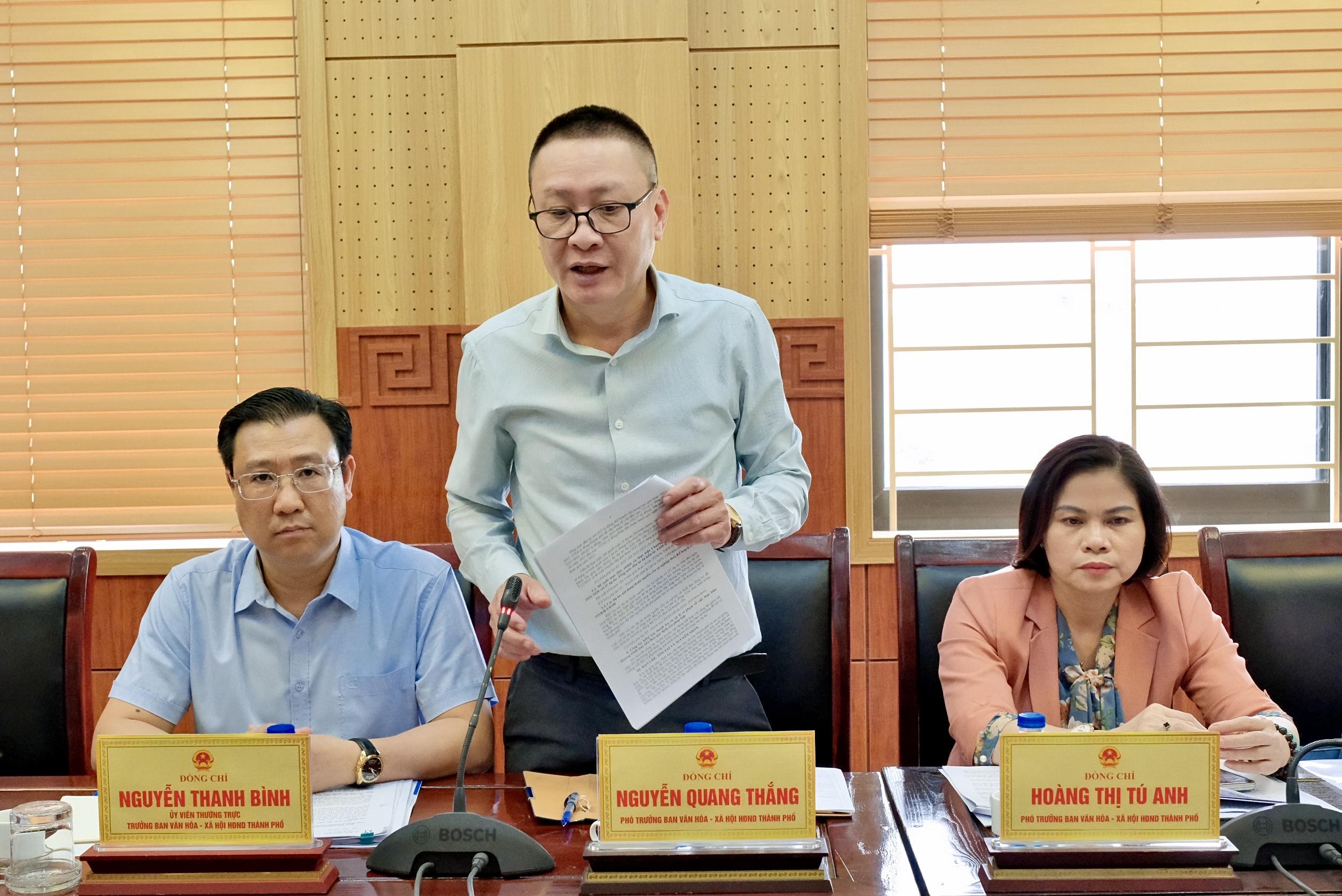 Trưởng ban Văn hóa - Xã hội HĐND Thành phố Nguyễn Thanh Bình phát biểu tại buổi làm việc