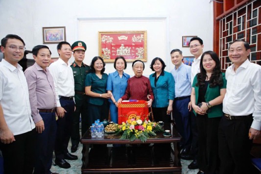 Bí thư Thành ủy Hà Nội Bùi Thị Minh Hoài và Đoàn thăm, tặng quà Bà mẹ Việt Nam anh hùng Công Thị Mùi. Ảnh: Viết Thành