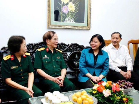 Đồng chí Bùi Thị Minh Hoài chúc Anh hùng Lực lượng vũ trang nhân dân Đào Duy Cảnh và các thương binh Nguyễn Hùng Phong, Nguyễn Trung Tiến, Nguyễn Đức Sáu dồi dào sức khỏe, có cuộc sống an vui, hạnh phúc.
